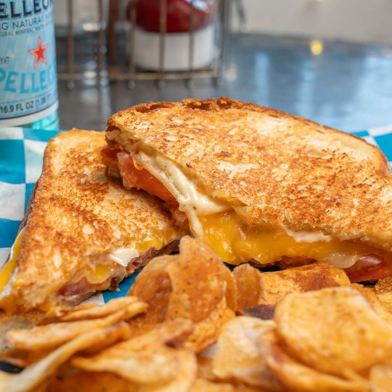 Crispy bacon, tomato, Swiss, Cheddar, American Cheese & mayo on panini bread.