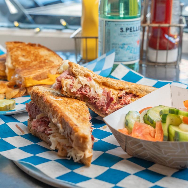 House-cooked corned beef, Swiss cheese, sauerkraut, & thousand island on toasted rye bread.